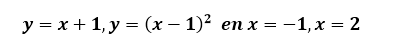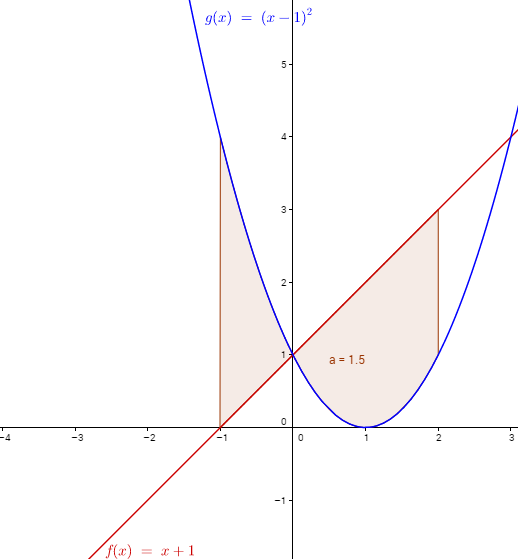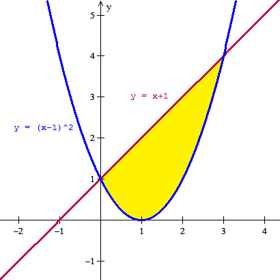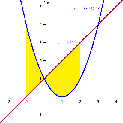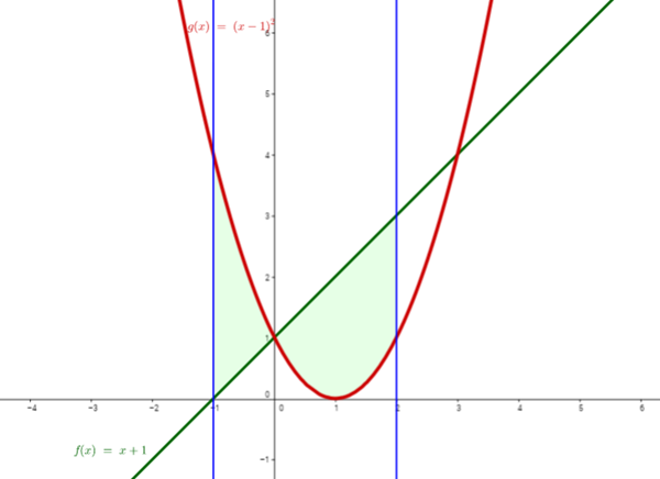$$\begin{align}&\int (x+1-(x-1)^2)dx=\\&\\&\int(x+1-x^2+2x-1)dx=\\&\\&\int(3x-x^2)dx=\frac {3x^2}2-\frac {x^3}{3}\\&\\&\text{El área de la región izquierda será el valor absoluto}\\&\text{de la definida entre -1 y 0}\\&\\&A_I=\left|0-0-\frac {3·(-1)^2}2+\frac {(-1)^3}3 \right|=\left|\frac 32-\frac 13 \right|=\\&\\&\left|\frac{-9-2}{6} \right|=\frac {11}6\\&\\&\text{Y la de la derecha es lo mismo entre 0 y 2}\\&\\&A_D=\left|\frac{3·2^2}{2}-\frac {2^3}3-0+0 \right|=\left|6-\frac 83 \right|=\frac{10}3\\&\\&\\&A=A_I+A_D=\frac {11}6+\frac{10}3=\frac{11+20}{6}=\frac{31}{6}\end{align}$$