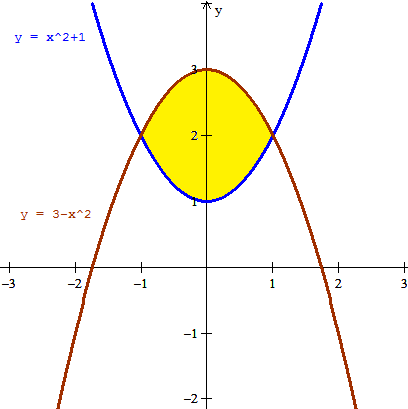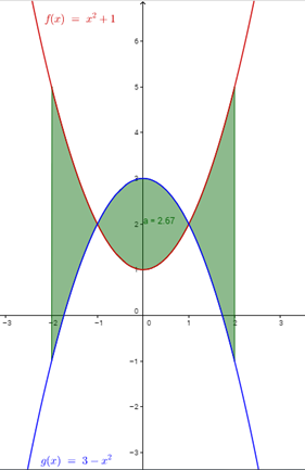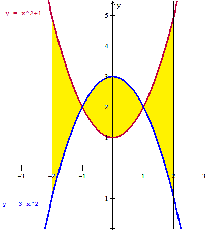 $$\begin{align}&A=2\left(\left| \int_0^1(3-x^2-(x^2+1)dx \right| +\left| \int_1^2(3-x^2-(x^2+1)dx \right| \right)=\\&\\&.... \text{las cuentas que hice antes}\\&\\&\\&=2\left(\;\;\left|2·\left[ x-\frac {x^3}3 \right]_0^1\right|\;\;+ \left|2·\left[ x-\frac {x^3}3 \right]_1^2\right| \right)=\\&\\&2\left(\;\;\left|2·\left( 1-\frac {1}3 \right)\right|\;\;+ \left|2·\left( 2-\frac {8}3-1+\frac 13 \right)\right| \right)=\\&\\&2\left(\frac 43+\left|2\left(1-\frac 73 \right) \right|\right)=2\left(\frac 43+\left|2\left(-\frac 43 \right) \right|\right)=\\&\\&2\left(\frac 43+\frac 83\right)=8\end{align}$$