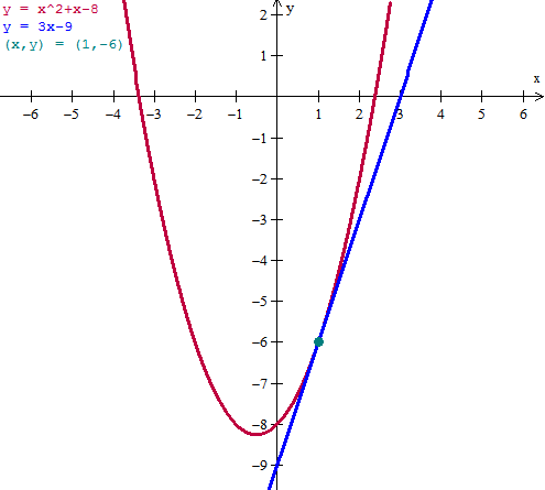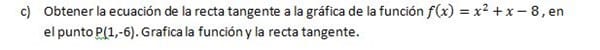 $$\begin{align}&y=y_0+f'(x_0(x-x_0)\\&\\&tenemos\\&f(x)= x^2+x-8\\&(x_0,y_0)=(1,-6)\\&\\&\text{Calculamos la derivada}\\&\\&f'(x)=2x+1\\&\\&f'(x_0)=f'(1) = 2·1+1= 2+1=3\\&\\&\text{Y la ecuación de la recta tangente es}\\&\\&y=-6+3(x-1)\\&y=-6+3x-3\\&y=3x-9\\&\end{align}$$Y eso es todo de momento, saludos.