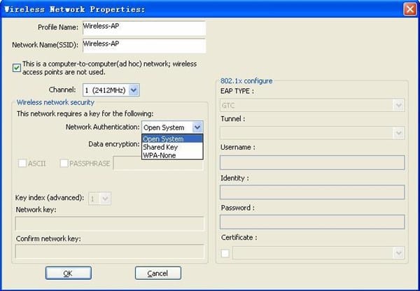 Choose the Network Authentication Mode and Data encryption from the drop-down menu.