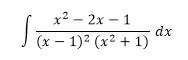 $$\begin{align}&\frac{x^2-2x-1}{(x-1)^2(x^2+1)}=\frac{a}{x-1}+\frac {b}{(x-1)^2}+\frac{cx+d}{x^2 +1}=\\&\\&\frac{a(x-1)(x^2+1)+b(x^2+1)+(cx+d)(x-1)^2}{(x-1)^2(x^2+1)}=\\&\\&\frac{ax^3-ax^2+ax-a+bx^2+b+cx^3-2cx^2+dx^2+cx -2dx+d}{(x-1)^2(x^2+1)}=\\&\\&a+c=0\\&-a+b-2c+d=1\\&a+c-2d=-2\\&-a+b+d=-1\\&\\&\text{Resto primera a la tercera }\\&-2d=-2\implies d=1\\&\text {Quedan estas tres}\\&a+c=0\\&-a+b-2c=0\\&-a+b=-2\\&\text{Resto tercera a segunda}\\&-2c=2\implies c=-1\\&\text{En la primera se deduce}\\&a=1\\&\text{Y en la tercera}\\&b=-1\\&\\&I=\int \frac{dx}{x-1}-\int \frac{dx}{(x-1)^2}+\int \frac{-x+1}{x^2+1}dx=\\&\\&ln|x-1|+\frac {1}{x-1}-\int \frac{x}{x^2+1}dx+\int \frac{dx}{x^2+1}=\\&\\&ln|x-1|+\frac {1}{x-1} -\frac 12ln(x²+1)+arctg \,x+C\end{align}$$