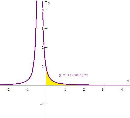 $$\begin{align}&\int_0^{\infty}\frac{dx}{(3x+1)^2}=\lim_{R\to\infty}\int_0^R \frac{dx}{(3x+1)^2}=\\&\\&\lim_{R\to\infty} \frac 13·\frac {-1}{3x+1}\bigg|_0^{R}=\lim_{R\to \infty}\frac 13\left(\frac{-1}{3R+1}+\frac{1}{3·0+1} \right)=\\&\\&\frac 13(0+1) =\frac 13\end{align}$$Así es mucho menos pesado.