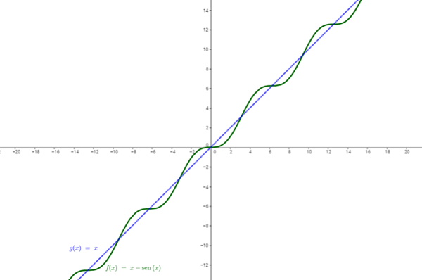 Encontrar los máximos, mínimos, puntos de inflexión de la siguiente función: f(x)=x-sen(x) y obtener su gráfica.