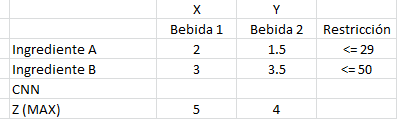 La bebida 1, requiere de 2 litros del ingrediente A y 3 litros. Del ingrediente B.
