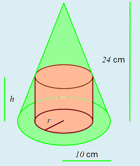 $$\begin{align}&\frac{2r}{20}=\frac{24-h}{24}\\&\\&\text{despejaré h porque luego no tendré que elevarla al cuadrado}\\&\\&48r =480 -20h\\&\\&20 h = 480 - 48r\\&\\&h = \frac{480-48r}{20 }=\frac{120-12r}{5}=\frac{12}{5}(10-r)\\&\\&\text{Con esto la fórmula del volumen pasará a tener una sola variable}\\&\\&V=\pi r^2h\\&\\&V(r) = \pi r^2·\frac{12}{5}(10-r)=\frac{12}{5}\pi(10r^2-r^3)\\&\\&\text{Derivamos e igualmos a 0}\\&\\&V'(r) = \frac{12}{5}\pi(20r-3r^2)=0\\&\\&20r - 3r^2=0\\&\\&r(20-3r) = 0\\&r=0 \quad\text{no sirve, el volumen sería 0}\\&\\&20-3r = 0\\&3r = 20\\&r=\frac {20}3\approx 6.6666...\\&\\&\text{Es el máximo porque sí, pero vamos a comprobarlo}\\&\\&V''(r)=\frac{12}{5}\pi(20-6r)\\&\\&V''\left(\frac {20}3\right) = \frac{12}{5}\pi\left(20-6·\frac{20}{3} \right)=\frac{12}{5}\pi\left(20-40 \right)\lt 0\\&\\&\text{Luego en }\quad r=\frac {20}3 \text{está el máximo}\\&\\&\text{La altura es }\\&\\&h=\frac{12}{5}(10-r)=\frac {12}5\left(10-\frac {20}3\right)=\frac {12}5·\frac {10}3=8\\&\\&\text{Y el volumen}\\&\\&V=\pi r^2h=\pi·\frac{400}{9}·8=\frac{3200\pi}{9}\approx 1117.010721\end{align}$$