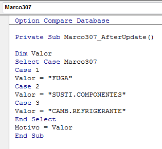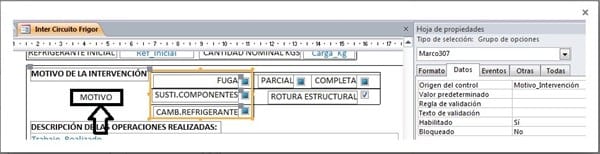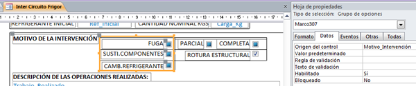 Tengo una base de datos, he puesto un control de grupo de opciones y me gustaría que me apareciera en la tabla donde se guardan los datos, en vez de números (1, 2, y 3), pues palabras como FUGA, SUST. Componentes, o camb. Refrigerante.