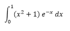$$\begin{align}&\text{La fórmula es:}\\&\int u\;dv=uv-\int{v\;du}\\&\\&\\&\int(x^2+1)e^{-x}dx=\\&\\&u=x^2+1\qquad du =2x\\&dv=e^{-x}dx\qquad v=-e^{-x}\\&\\&=-(x^2+1)e^{-x}+\int 2xe^{-x}dx=\\&\\&u=2x\qquad \qquad du = 2 \,dx\\&dv=e^{-x}dx\qquad v=-e^{-x}\\&\\&=-(x^2+1)e^{-x}-2xe^{-x}+\int 2{e^{-x}}\,dx=\\&\\&-(x^2+1)e^{-x}-2xe^{-x}-2e^{-x}+C=\\&\\&(-x^2-1-2x-2)e^{-x}+C=\\&\\&-(x^2+2x+3)e^{-x}+C\\&\\&\text{Y ahora la aplicamos al intervalo [0,1]}\\&\text{por el segundo teorema fundamental del cálculo}\\&\text{La C la puedes poner o no, a tu gusto y del profe}\\&\\&\text{Llamamos }F(x)=-(x^2+2x+3)e^{-x}\\&\\&\text{entonces}\\&\\&\int_0^1(x^2+1)e^{-x} dx = F(1)-F(0)=\\&\\&-(1^2+2·1+3)e^{-1}-\left[-(0^2+2·0+3)e^{-0} \right]=\\&\\&-(1+2+3)e^{-1}+3e^0=\\&\\&-6e^{-1}+3= 3-\frac 6e\\&\\&\end{align}$$Y eso es todo, espero que te sirva y lo hayas enendido.