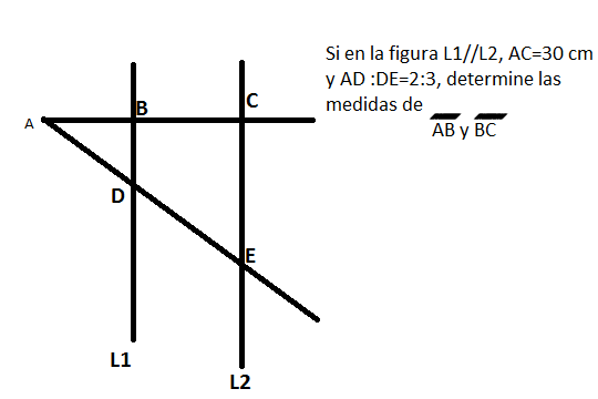 En la figura l1/l2 , AC =30cm y AD:DE= 2:3, determinar las medidas de AB y BC.