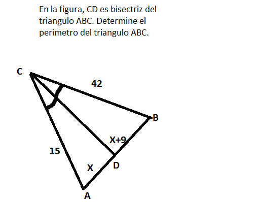 En la siguiente figura, CD es bisectriz del triangulo ABC. Determine el perímetro del triangulo ABC.