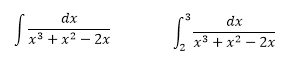 $$\begin{align}&\frac{1}{x^3+x^2-2x}=\frac ax+\frac{b}{x+2}+\frac{c}{x-1}=\\&\\&\frac{a(x+2)(x-1)+bx(x-1)+cx(x+2)}{x(x+2)(x-1)}\\&\\&\text{Para raíces distintas lo mejor es dar valores}\\&\text{de las raíces a x e igualando los polinomios:}\\&a(x+2)(x-1)+bx(x-1)+cx(x+2)=1\\&\\&\text{Para x=0} \implies a·2·(-1)=1\implies a=-\frac 12\\&\\&\text{Para x=-2 }\implies b(-2)(-3)=1\implies b= \frac 16\\&\\&\text{Para x=1}\implies c·1·3=1 \implies c=\frac 13\\&\\&\int \frac{dx}{x^3+x^2-2x}=\\&\\&-\frac 12\int \frac{dx}{x}+\frac 16\int \frac{dx}{x+2}+\frac 13\int \frac {dx}{x-1}=\\&\\&-\frac{ln |x|}{2}+\frac{ln |x+2|}{6}+\frac {ln |x-1|}3+C\\&\\&------------------\\&\\&\int \frac{dx}{x^3+x^2-2x}=\left[-\frac{ln |x|}{2}+\frac{ln |x+2|}{6}+\frac {ln |x-1|}3\right]_2^3=\\&\\&-\frac{ln\,3}{2}+\frac{ln \,5}{6}+\frac {ln \,2}3 +\frac{ln\,2}{2}-\frac{ln \,4}{6}-\frac {ln \,1}3=\\&\\&-\frac{ln\,3}{2}+\frac{ln \,5}{6}+\frac {5\,ln \,2}6 -\frac{ln \,4}{6}=\\&\\&-\frac{3ln\,3}{6}+\frac{ln \,5}{6}+\frac {5\,ln \,2}6 -\frac{ln \,4}{6}=\\&\\&\frac 16 · ln\left(\frac{5·2^5}{3^3·4}\right)= \frac 16·ln\left(\frac {160}{108} \right)=\frac 16 ln\left(\frac{40}{27} \right)\\&\\&\\&\end{align}$$: