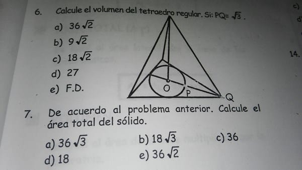 $$\begin{align}&\left(\frac a2\right)^2+(3 \sqrt 3)^2=a^2\\&\\&\frac{a^2}{4}+27=a^2\\&\\&\frac 34 a^2=27\\&\\&a^2 = 36\\&\\&a=6\\&\\&\text{El área de la base será}\\&\\&A_b=\frac {6·3 \sqrt 3}2=9 \sqrt 3\\&\\&\text{Y ahora hay que calcular la altura del tetraedro}\\&\text{Para no confundirla la llamaré H}\\&\\&\text{H, OQ y a forman un triángulo rectángulo}\\&\text{de nuevo te doy un resultado }\quad OP=\frac h3\\&\\&OQ=\frac h3 + \frac h3 = \frac {2h}3= \frac{2·3 \sqrt 3}{3}=2 \sqrt 3\\&\\&\text{Por Pitágoras}\\&H^2+(2 \sqrt 3)^2 = 6^2\\&\\&H^2=36-12=24\\&\\&H=\sqrt {24}=2 \sqrt 6\\&\\&\text{Y el volumen será}\\&\\&V= \frac 13 A_b·H =\frac 13·9 \sqrt 3·\sqrt 6=6 \sqrt{3}\sqrt {2·3}=\\&\\&6·\sqrt{2·3^2}= 6·3 \sqrt 2=18 \sqrt 2\end{align}$$Luego la respuesta del ejercicio 6 es la c)