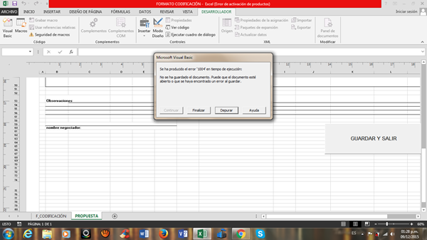 listo ya te lo envié, el archivo se llama formato de codificación, la hoja es la que se llama propuesta, no se si lo largo de los nombres puede ser lo que hace que falle, porque hay ocasiones donde si funciona, pero en el ejemplo que te mando no lo hace, toda la creación de la carpeta y los archivos es al oprimir el botón salir y guardar ubicado en la parte inferior de la hoja propuesta.