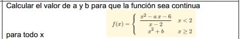 $$\begin{align}&\lim_{x\to 2^-}\frac{x^2+x-6}{x-2}=\\&\\&\text{ya sabíamos que x=2 era un raíz, luego}\\&\\&x^2+x-6 = (x-2)(x+b)\\&\\&\text{para que salga el -6 debe ser b=3, en efecto}\\&\\&(x-2)(x+3) = x^2-2x+3x-6=x^2+x-6\\&\\&\text{sustituimos en el límite}\\&\\&=\lim_{x\to 2^-}\frac{(x-2)(x+3)}{x-2}=\lim_{x\to 2^-}(x+3)=5\\&\\&\text{Y este límite debe coincidir con el derecho y el valor}\\&\text{de la función, que se obtienen los dos al alimón}\\&\\&\lim_{x\to 2^+}g(x)=g(2)=2^2+b\\&\\&4+b=5\\&\\&b=1\end{align}$$