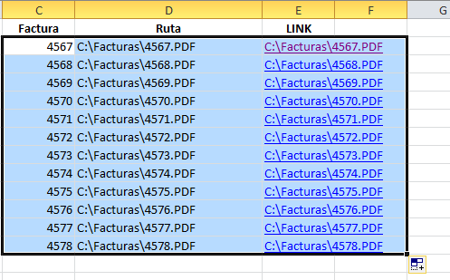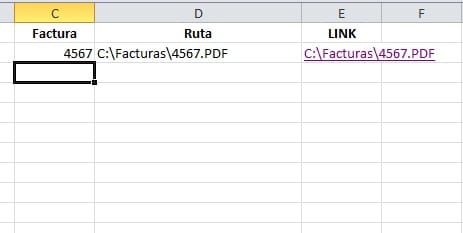 Tengo facturas ingresadas y la columna "C" corresponde al numero de la factura, cada factura se encuentra digitalizada en formato pdf en la carpeta "C:\Facturas". La idea es hacer una búsqueda del valor de la factura Ej. La factura 4567 corresponde al "4567.pdf" en el fondo, necesito algo similar a crear hipervínculos automáticos o que encuentre y abra el archivo según sea el nombre de su celda.