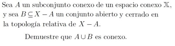 Sea A un subconjunto conexo de un espacio conexo X, y sea B (subconjunto propio) X-A un conjunto abierto y cerrado en la topología relativa de X-A. Demuestre que AUB es conexo. Problema de Demostración de Topología. El tema se llama Conexidad por trayectorias y compacidad.