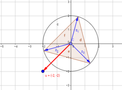 $$\begin{align}&\text{Sea el complejo z = a+bi; r raíz enésima de z, entonces:}\\&Módulo:\\&|r| = \sqrt[n]{r}\\&Argumento:\\&a_r = \frac{a_z + 2k \pi}{n}.........k=0, 1, 2, ..., n-1 \text{ (en radianes) ó}\\&a_r = \frac{a_z + 360° k}{n}.........k=0, 1, 2, ..., n-1 \\&En\ este\ caso:\\&z=-2-2i\\&a_z = arctg\bigg(\frac{-2}{-2} \bigg) = 225°\\&|r| = \sqrt[3]{(-2)^2+(-2)^2} = \sqrt[3]{8} = 2\\&a_r = \frac{225° + 360° k }{3}.........k=0, 1, 2\\&a_{r1} = \frac{225° }{3} = 75°\\&a_{r2} = \frac{225°+360° }{3} = 195°\\&a_{r3} = \frac{225° + 360° \cdot 2}{3} = 315°\end{align}$$Claramente una raíz cúbica definirá un triángulo, y además será regular por lo que se trata de un triángulo equilátero.