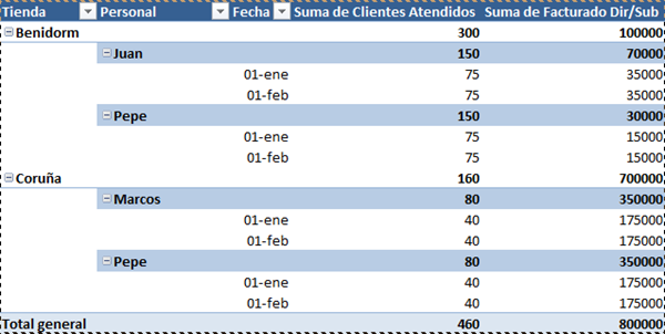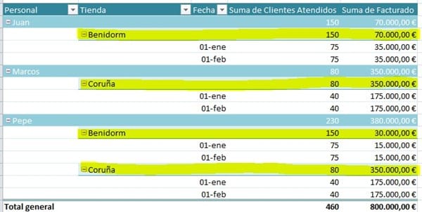 ¿Como podría hacer la base de datos o cambiar la tabla dinámica que por ejemplo en Juan en la tienda Benidorm apareciera en vez del Subtotal de Juan el el Total de la tienda,
