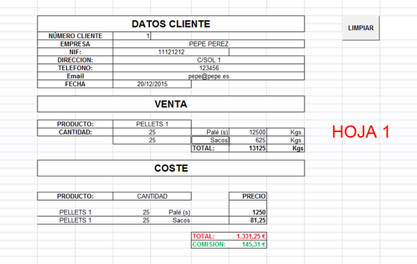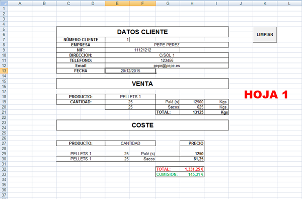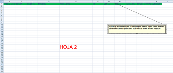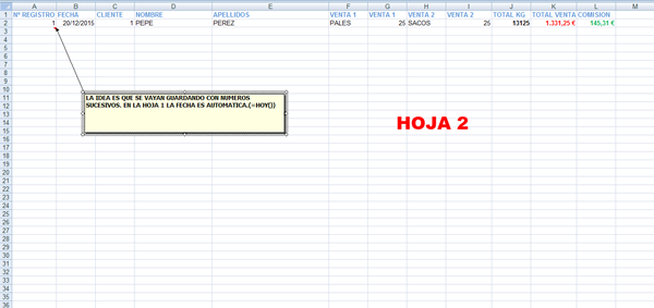 En la Hoja 1 introduzco datos de una venta. Las celdas las tengo distribuidas, de manera que no tengo todos los datos de una venta en una fila o una columna, si no que yo las he distribuido de la manera que mas me convenía.