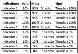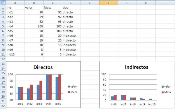Tengo indicadores de gestión directos e indirectos (tienden a 100% y los otros tienden a 0%). Deben ir dibujar el resultado individual con su meta (100% o 0%). ¿En qué tipo de gráfico puedo presentar los resultados de ambos tipos de indicadores?
