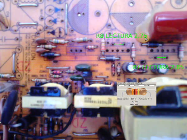 Bueno he podido conseguir esta placa... que al menos me da una orientación pues... estas resistencias están colocadas parecido a la de la otra placa... aunque sus lecturas están bajas...¡ Pienso yo ! Estas resistencias son de 3.1 K, colores: naranja, marrón, rojo, dorado... y como muestro.. una mide 2.85 y la otra 2.75...