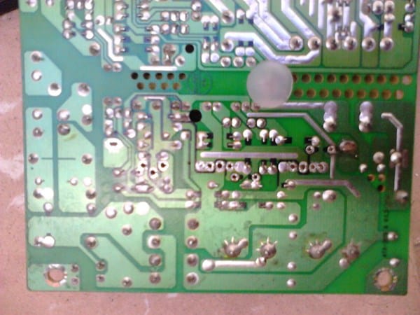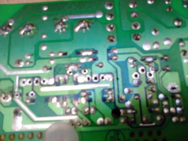 Lo que me acabo de fijar ahora es que una de las resistencias perdidas... precisamente la que estaba totalmente calcinada y rota en dos... concretamente la que marco como resistencia 1 y en la placa viene marcada como R11, al verla por atrás... veo que corre una línea de estaño en busca de dos diodos que e probado y están en condiciones sin contacto a ellos y esa misma línea pasa a unos condensadores pequeños y una bobina marcada como KD-T010DY YT EL-16A pero sin contacto con ellos.