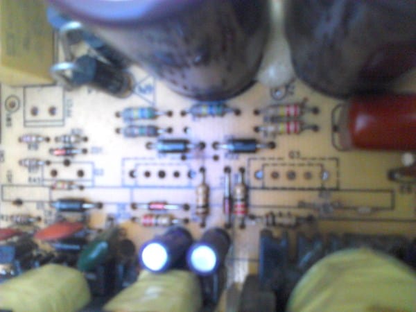 4.- Existen 4 resistencias asociadas a los transistores de potencia que suelen deteriorarse, especialmente si estos se ponen en corto. Los valores varían entre las distintas marcas pero se identifican pues 2 de ella se conectan a las bases de dichos transistores y rondan en los 330k Ohms mientras que las otras dos son de aproximadamente 2,2 Ohms y se conectan a los emisores de los transistores.