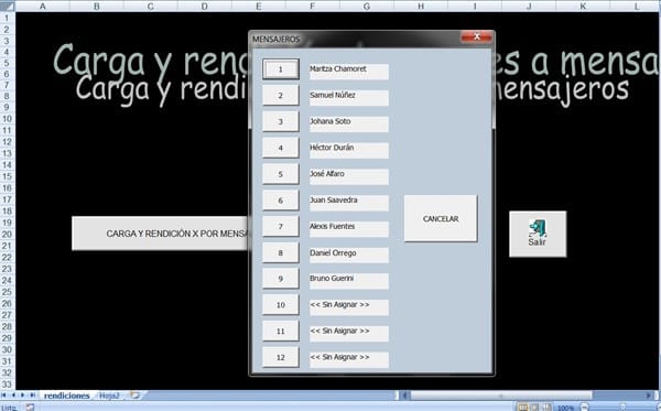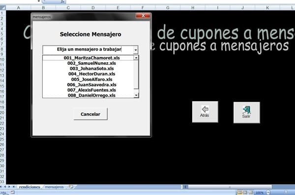 Yo en estos momentos en la hoja1 (rendiciones) presiono un botón (commandbutton) y me abre un formulario en el cual llamo a los demás excel con botones solamente , en este formulario yo quiero desplegar una lista con lo que tengo en la hoja2 (mensajeros) y al seleccionar uno, se abra el excel que corresponde a ese mensajero o mejor dicho al nombre del archivo excel que coincidan.