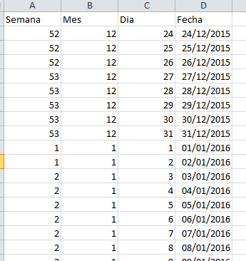 Según tu imagen, la fecha la tienes en la columna D, y quieres la semana en la A, el mes en la B y el día en la C.
