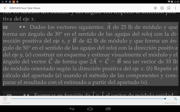 $$\begin{align}&R = 2A + C - B\\&(35, 0) = 2(25cos(-30°), 25sen(-30°)) + (C_x, C_y) - (42cos(40°), 42sen(40°))\\&\text{Si tienes duda con el planteo anterior avisa, pero lo que hice fuí escribir los datos que nos dieron como}\\&\text{coordenadas, considerá que 50° en sentido horario desde el eje +Y es l mismo que 40°}\\&\text{Sigo con las cuentas}\\&(35, 0) = (50cos(-30°), 50sen(-30°)) + (C_x, C_y) - (42cos(40°), 42sen(40°))\\&\text{Igualo cada una de las coordenadas}\\&35 = 50cos(-30) + C_x - 42cos(40)\\&0 = 50sen(-30) + C_y - 42sen(40)\\&\text{Y ahora son todos números, voy a usar 4 decimales}\\&C_x = 35 - 43.3013+32.1739 = 23.8726\\&C_y = 25+26.9971 = 51.9971\\&\text{y el vector C es (23.8726,51.9971) que si lo querés expresar como módulo y ángulo, sería}\\&|C| = \sqrt{23.8726^2+51.9971^2}= 57.2154\\&\alpha = ArcTan(\frac{51.9971}{23.8726}) = 65°339\end{align}$$