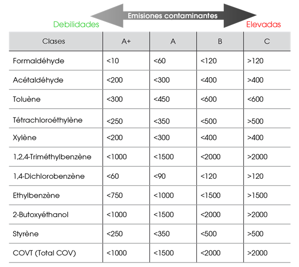 Los productos comercializados antes de esa fecha deberán estar etiquetados antes del día uno de septiembre de 2013. El objetivo de esta medida es informar al consumidor sobre los riesgos de toxicidad por inhalación relacionados con estos contaminantes tales como el formalheído, el tolueno o también el estireno, que pueden conllevar patologías tales como el asma o las alergias. Los productos afectados por esta nueva reglamentación son los productos de construcción y revestimientos de paredes y suelos así como las pinturas, barnices, colas, adhesivos, etc. El nivel de emisión del producto está indicado por una clase que va desde la A+ (muy pocas emisiones) hasta C (muchas emisiones), según el principio ya utilizado para el sector de electrodomésticos o de automoción.