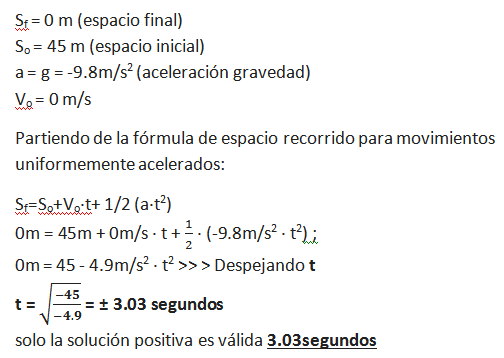$$\begin{align}&y(t)=\frac 12 at^2+v_0t+y_0\\&\\&\text{Se suele hacer }y_0=0\text{ y lo hacemos}\\&\text{ello implica que el punto (0,0) es desde donde}\\&\text{se deja caer y el punto de llegada es (0,-45)}\\&\text{Como se deja caer es }V_0=0\\&\text{Y la aceleración es negativa ya que va hacia abajo}\\&\text{luego su valor es }-g=-10m/s^2\\&\\&-45=\frac 12 (-10m/s^2)·t^2\\&\\&-45=-(5m/s^2)·t^2\\&\\&t^2=9s^2\\&\\&t=\sqrt{9s^2} = 3s\end{align}$$