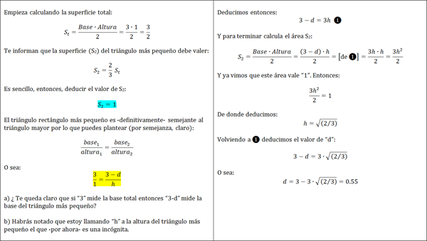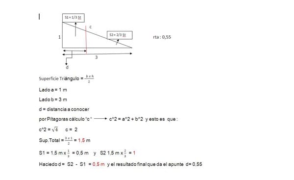 Amigos les envío como he resuelto el siguiente ejercicio, necesito me controlen el mismo y corrijan. El mismo dice: ¿A qué distancia "d" hay que dividir el siguiente triángulo para que la superficie de sus partes sean respectivamente ( 1/3 y 2/3 ) de la superficie total?, Las medidas de los lados del triángulo no dicen si so mts o cm, yo los tome en metros.