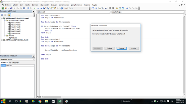 Para ocultar hojas, pero al ejecutar ocultar, se oculta las hojas y me sale un cuadro de error como lo indico en la siguiente imagen: ¿Cómo se puede solucionar este error?