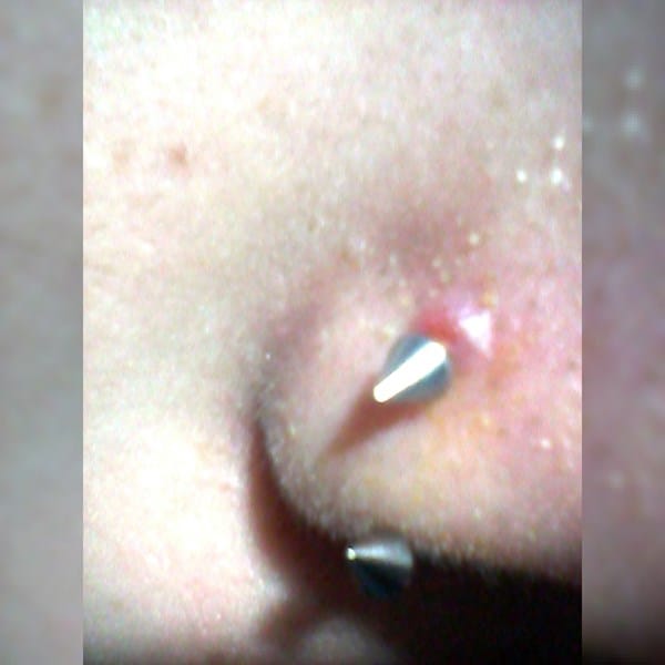 Son Belén, tengo 15 años, y me paso lo siguiente: El 19 de diciembre de 2015 me hice el piercing nostril, con consentimiento de mis padres, la chica que me lo hizo me dijo que me curara con Rifocina o Pervinox durante un mes, dos veces al día. Tuve la mala costumbre de estar moviendolo, ya que es abierto (como muestra la foto), y el sábado 26 (a la semana de hacermelo) fui a cumpleaños y mientras bailabamos se me enganchó con el pelo de una chica y me lo tironeo, dolió y a los días vi que me salió ese bulto o granito que muestra la foto, al principio era pequeño, ahora esta más grande. Este granito no duele, no pica ni arde ni nada, solo si me lo toco duele pero muy poco
