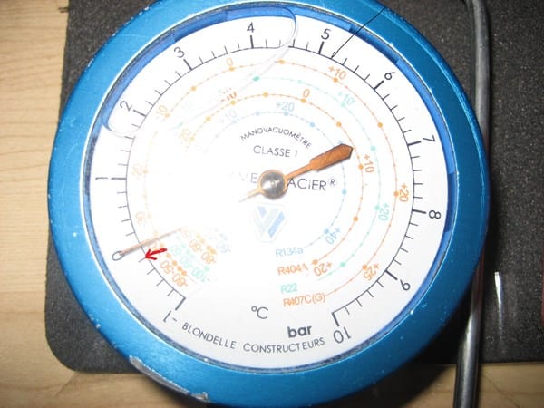 Gracias por tu, respuesta.Te comento, mis manómetros están calibrados en bar, pero tiene divisiones(10 div/bar) y como 1 bar =14,7libras aproxim. ( 2,14 libras= 3 div. ) el problema es que cantidad de gas r600 a le recargo el circuito por retorno y a qué( presión/temp ) lo dejo para no pasarme,ya que no tengo información de la etiqueta del frigo,pues carece de ésta.creo que la carga de gas está en torno a 60 grm.