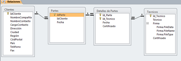Debes tener una tabla “Detalles de Partes”, relacionada con la tabla Partes, ésta relacionada con la tabla Máquinas, y esta última con la Tabla Clientes; porque son varias partes que tiene una máquina. Y esta tabla debe estar relacionada con la Tabla Técnicos por medio de un campo común, o sea, Id_Tecnico, o sea, la tabla “Detalles de Partes”.