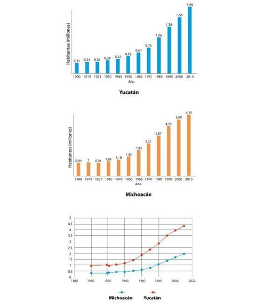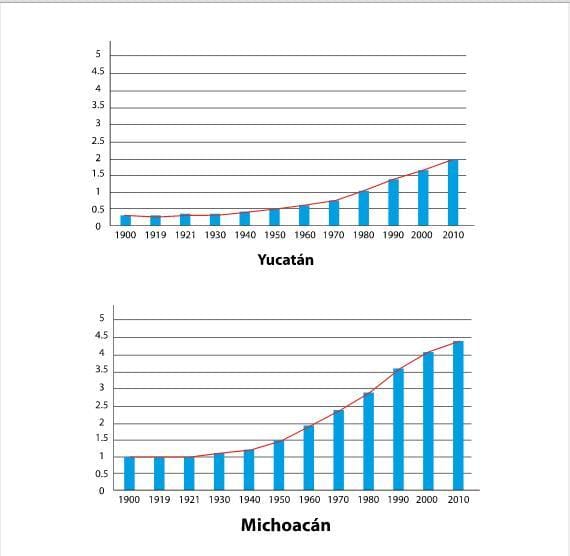 A continuación se te muestran dos gráficos que representan el registro de los censos de población de Yucatán y Michoacán desde el año 1900 hasta el 2010.