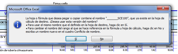 Tengo un archivo de excel que es el resultado que se obtiene en un programa llamado opus, este archivo de excel es pesado y cuando quiero hacer una copia de una hoja a otro libro o dentro del mismo libro me tira un mensaje que dice La hoja de formula que desea copiar o pegar contiene el nombre------- y me tira una cantidad de nombres cada vez que le doy SI aparece otro y otro, según