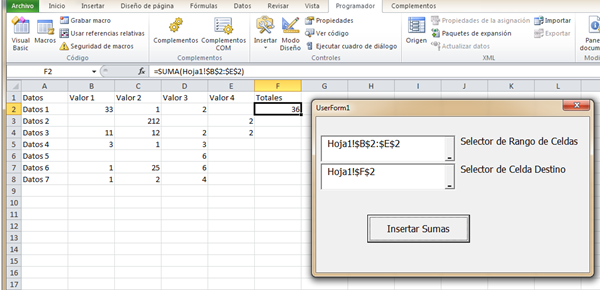 Y RefEditResultado es el nombre dado al RefEdit para capturar la celda destino donde va a ir la fórmula SUMA. Esto se hace en la ventana de propiedades de cada control.