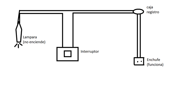 He sacado de la caja de registro 2 cables, uno para un enchufe que funciona correctamente, y otro para un interruptor hacía una lámpara, la cual no enciende, dejo el circuito realizado por si me equivoco en algo, gracias.