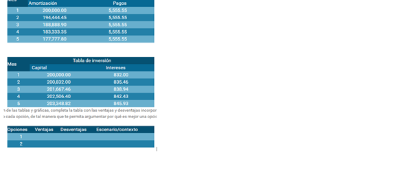 En la siguiente tabla puedes ver los cálculos de los primeros cinco meses para ambas opciones, completa la tabla en un programa de hoja de cálculo. Realiza las operaciones para cada opción, grafica la amortización y el capital en los tres años.