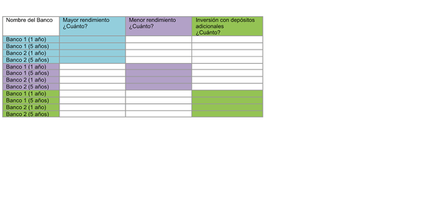- Identifica dos bancos que te ofrecen el rendimiento más alto si lo inviertes a uno y a cinco años.