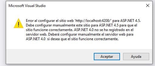 ¡Gracias! Yo abro visual studio y desde hay le doy play al proyecto el me abre el navegador se supone que debería abrir la que viene creada por defecto que es una pagina con su inicio de sesión para registrarse y todo eso que uno va cambiando a medida que va creando la aplicación web pero salia ese error, resulta que desistale todo lo que tenia que ver con programación que tenia instalado el visual, el sql el ISS, el framework, el asp.net, etc y volví a instalarlo pero me seguía saliendo el mismo error así que por el símbolo de sistema intente de habilitar de nuevo lo que decía en el error como sugerencia de que podía tratar de hacer y luego abro visual studio creo una aplicación (me sale un nuevo error que antes no salia) relacionado con que toca cambiar manualmente asp.net