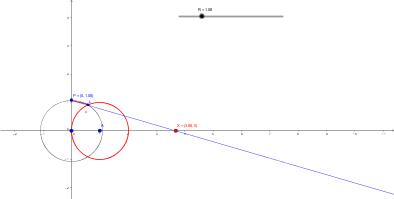 Sea una circunferencia de radio 1 con centro en (1, 0) y una circunferencia de radio R centrada en el origen. Unimos el punto (0, R) con el punto de intersección de las circunferencias (en y > 0) y alargamos el segmento hasta que corte al eje horizontal en X. ¿Qué ocurre con X cuando R se hace más y más pequeño?
