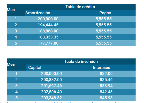 A partir de la información de las tablas y gráficas, completa la tabla con las ventajas y desventajas incorpora en qué contexto o escenario se lleva a cabo cada opción, de tal manera que te permita argumentar por qué es mejor una opción u otra.