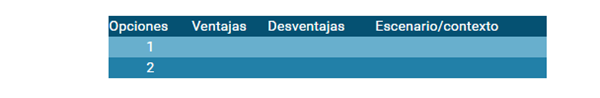 d) Incorpora la tabla con las ventajas y desventajas de cada opción de acuerdo con un escenario específico.