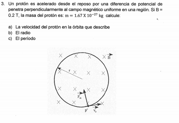 . Radio = mv / qB = (1.67 x 10^-27 Kg x 1.957 x 10^7 m/seg) / ( 1.60 x 10^-19 C x 0.20 T)