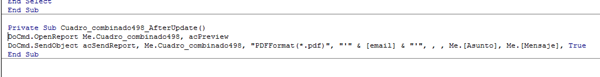 DoCmd.SendObject acSendReport, Me.Cuadro_combinado498, "PDFFormat(*.pdf)", "'" & [email] & "'", , , Me.[Asunto], Me.[Mensaje], True
