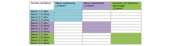 - Identifica dos bancos que te ofrecen el rendimiento más alto si lo inviertes a uno y a cinco años.