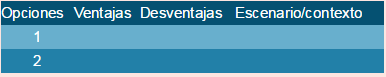 d) Incorpora la tabla con las ventajas y desventajas de cada opción de acuerdo con un escenario específico.
